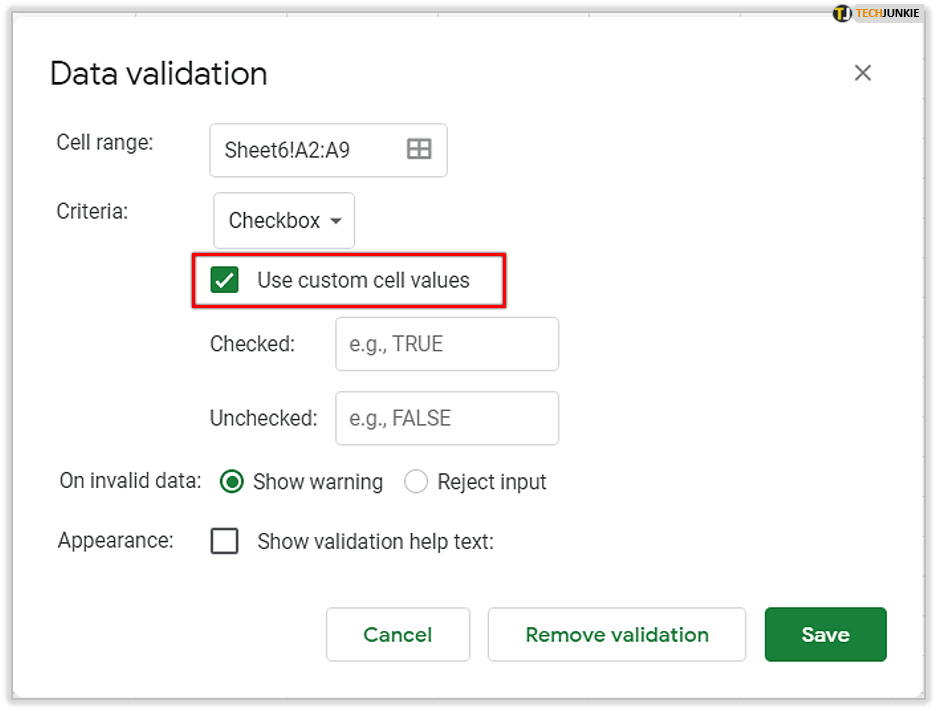 - 选择“使用自定义单元格值”并输入这些值。您可以在“选中”和“未选中”旁边输入值。