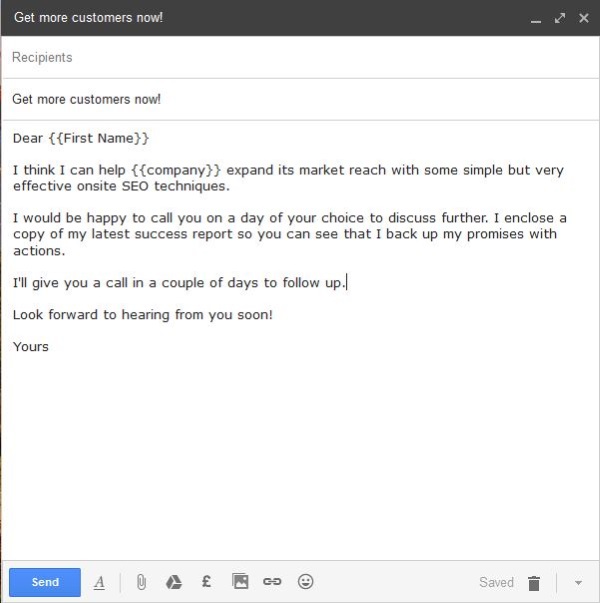 - 添加“亲爱的 {{First Name}” }' 到电子邮件的第一行。您可以将“亲爱的”更改为最适合您的观众的任何内容。这只是为了演示。您还可以使用 {{Salutation}} 并在您的 Google 表格中添加一个称呼列来真正个性化您的邮件。