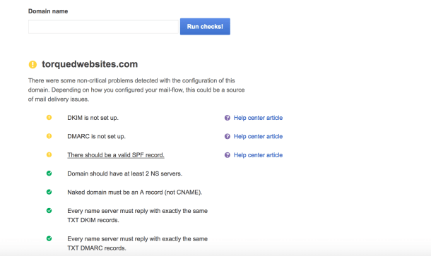 搞乱 DNS 设置可能会很痛苦,尤其是当您将某些内容混淆时。 Google 在 G Suite 工具箱中提供的工具之一是 Check MX——一种 DNS 验证工具,可检查您可能面临的常见问题。只需点击 G Suite 工具箱中的工具,输入您的域,它就会为您提供结果列表,为您提供特定 DNS 配置的通过、建议或失败。
