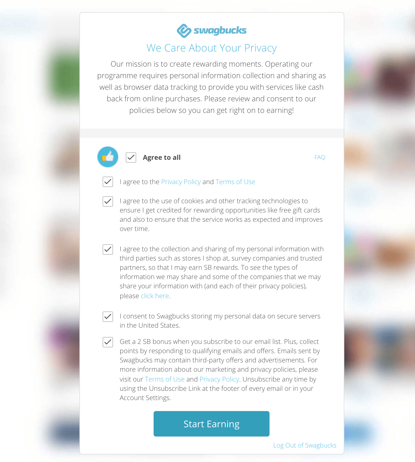 接下来,您将被带到隐私政策窗口,您需要在窗口顶部选中“全部同意”。还有一个选项可以选中一些框,而让其他框保持原样。完成此操作后,单击或点击“开始赚钱”按钮,您就可以开始了。