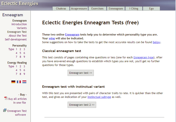 Eclectic Energies 有两个九型人格测试,您可以在他们的网站上进行。第一个是发现您的主要性格类型的经典测试。第二个旨在发现您的子类型并深入挖掘。两者都值得一试。这两种测试都很容易进行,而且速度相对较快。当第一个对你的身份有足够的了解时,它会停止问你问题。无论如何,第二个只有几个问题。