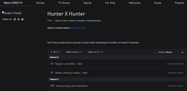 DirecTV 是一种付费流媒体服务,可与 Netflix、Hulu、Sling 等公司竞争。它还包含 Hunter x Hunter 剧集。目前第 5 季和第 6 季的阵容中有 15 个。无论如何都不是整个范围,但如果你是 DirecTV 的订阅者,这只是锦上添花。