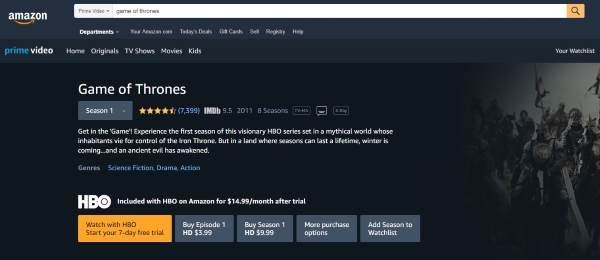 亚马逊视频是观看《权力的游戏》的一种更昂贵的方式,但您仍然可以这样做。每集约 3.99 美元或每季 9.99 美元,您可以在亚马逊服务上观看全高清。他们有所有剧集和所有季节,你可以挑选你想看的。