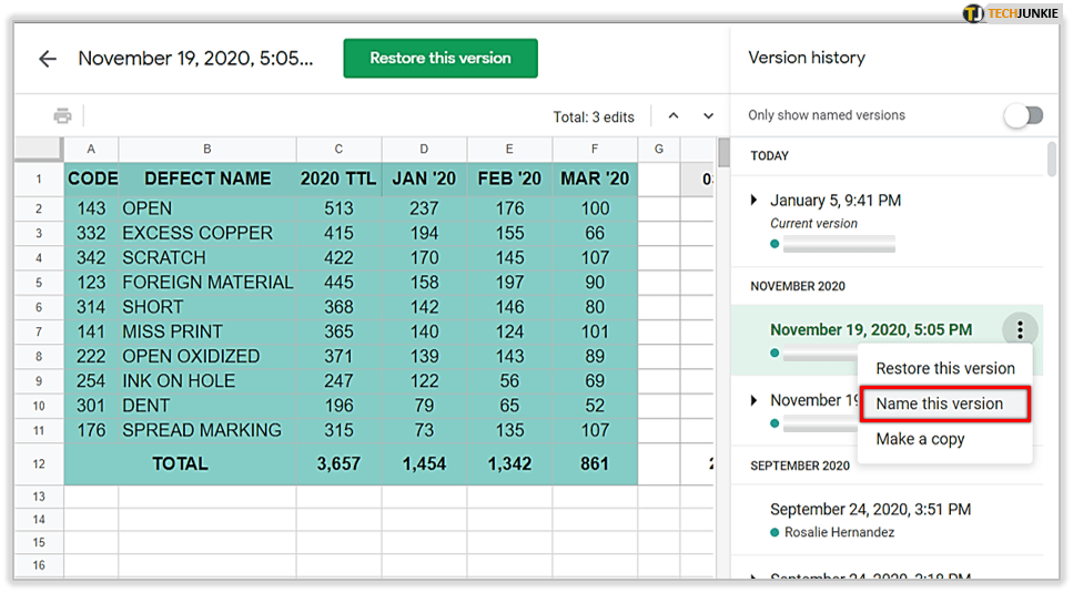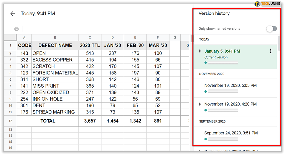 跟踪更改功能是跟踪文档中所有编辑的最佳方式之一。在“版本历史”选项卡中,您可以查看谁在您的工作表中添加了最新信息以及何时添加了最新信息,以便您可以在那里跟踪更改。此外,您甚至可以保存任何文档的旧版本之一以备后用。
