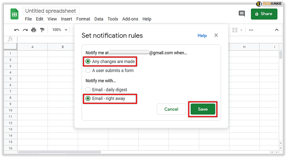 - 在打开的窗口中,标记以在“进行任何更改”时收到通知。在“通知我......”中选择一个选项,然后点击“保存”。