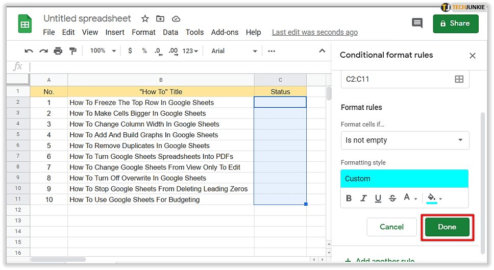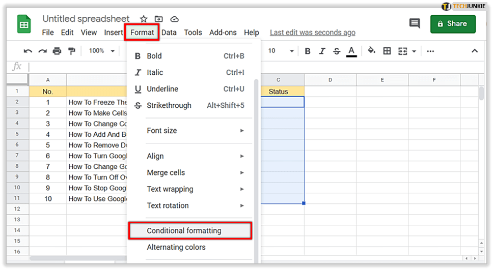 - 打开电子表格并标记要应用条件格式的单元格。