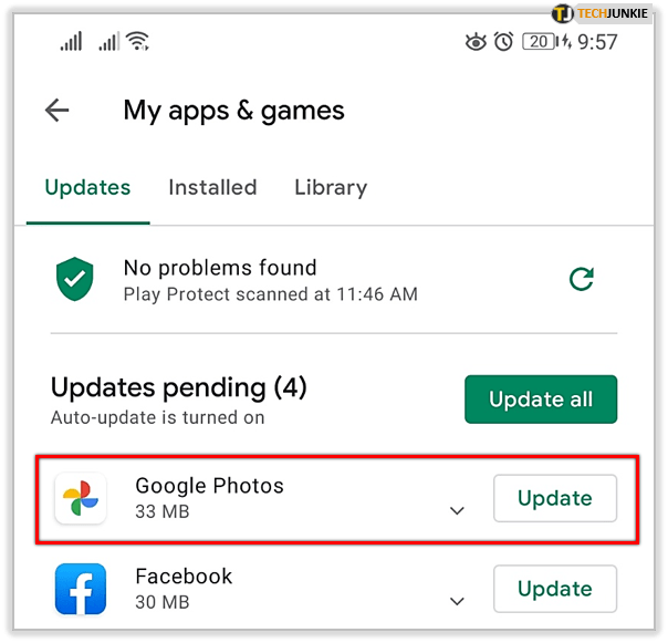 无论您是只使用 Google 相册应用还是附加的“备份与同步”应用,您都可能需要检查是否有任何可用的更新。访问 App Store 或 Google Play 商店检查更新,因为当有更新版本等待下载时,应用程序容易出现错误。