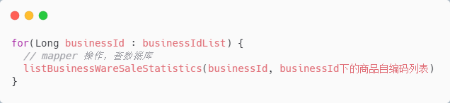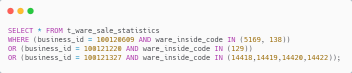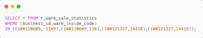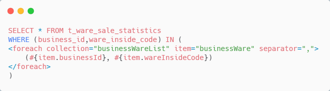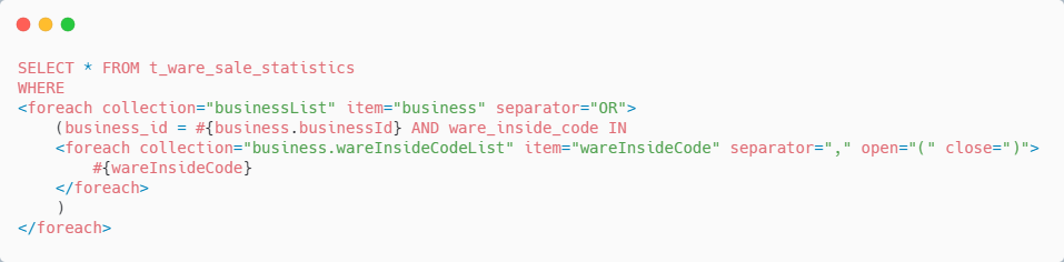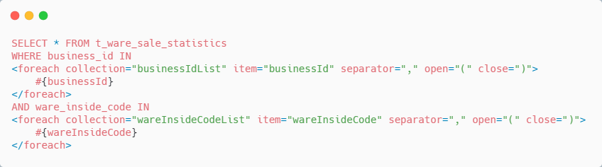 同样是利用 Mybatis 的 动态 SQL ,将 business_id 串列拼在一起、 ware_inside_code 拼在一起,类似如下