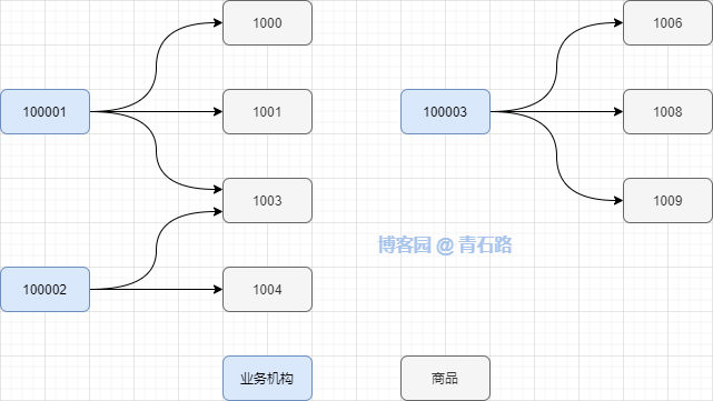 业务机构下销售商品,同个业务机构可以销售不同的商品,同个商品可以在不同的业务机构销售,也就说:业务机构与商品是多对多的关系