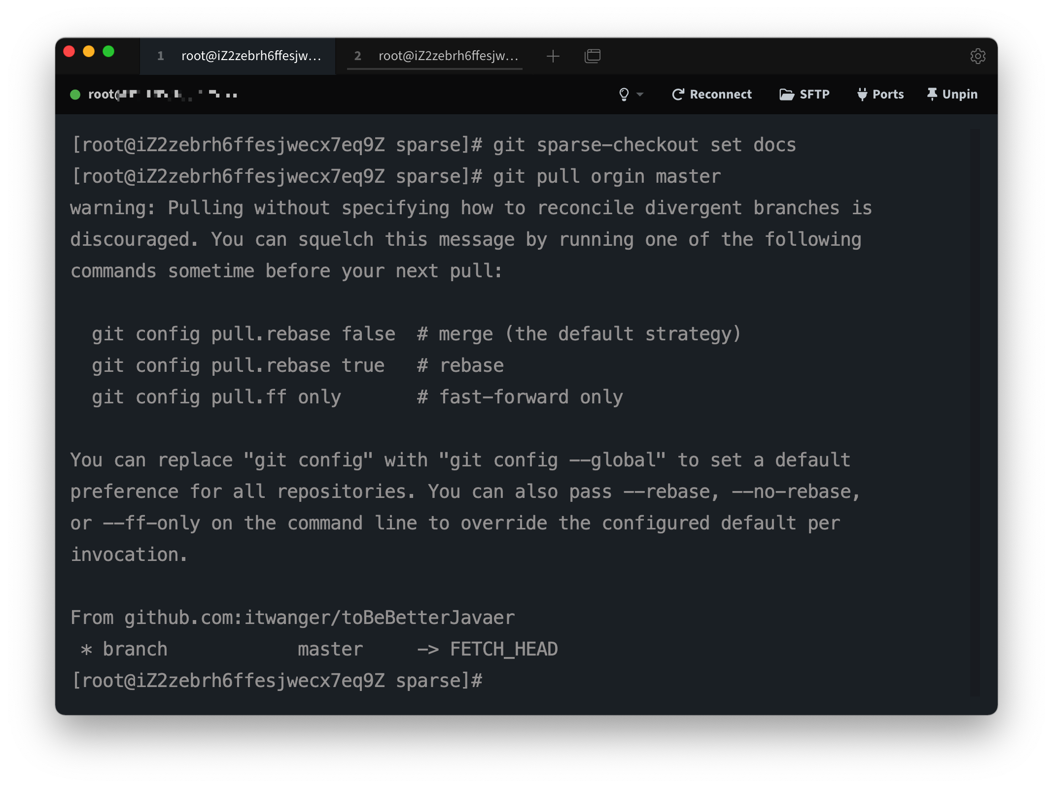 如果是第一次使用 sparse-checkout 的话,还需要执行一下 git pull orgin master 命令拉取一次,