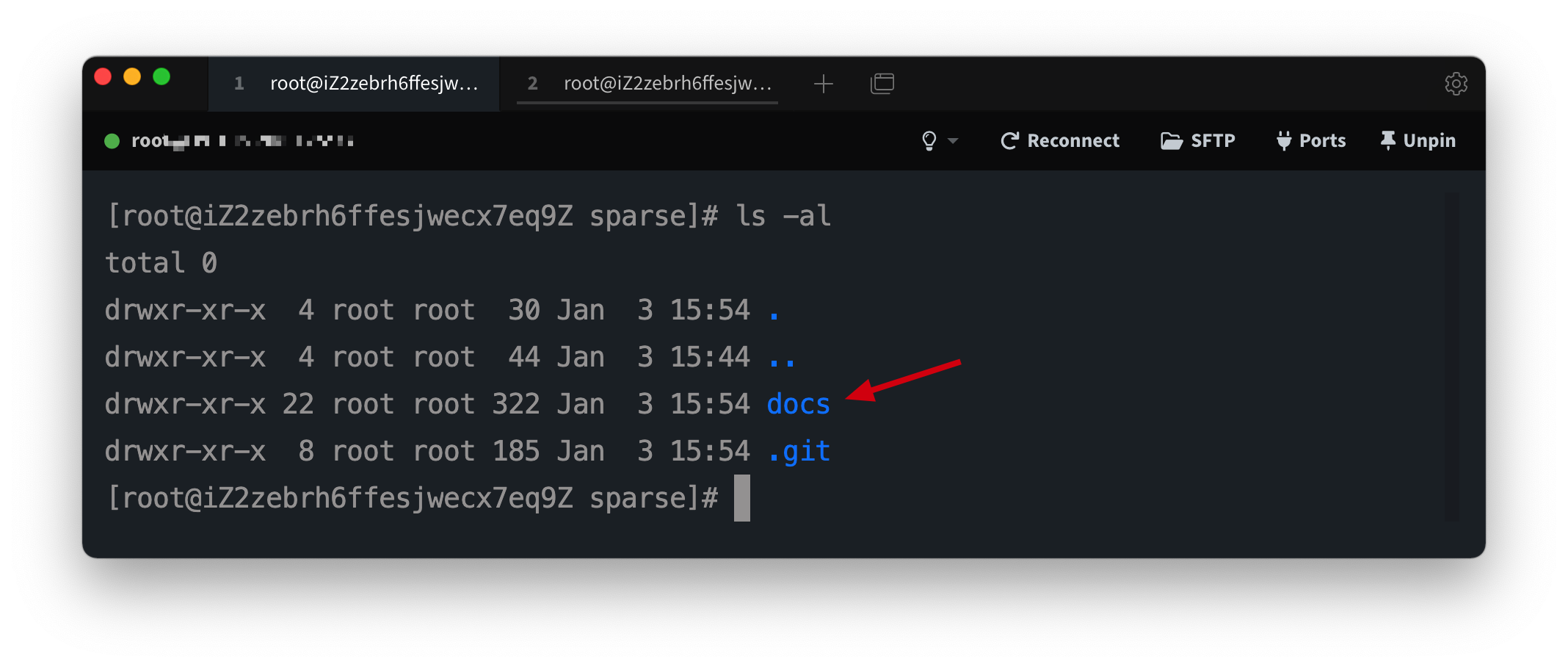 可以执行 ls -al 命令来确认 sparse-checkout 是否生效,