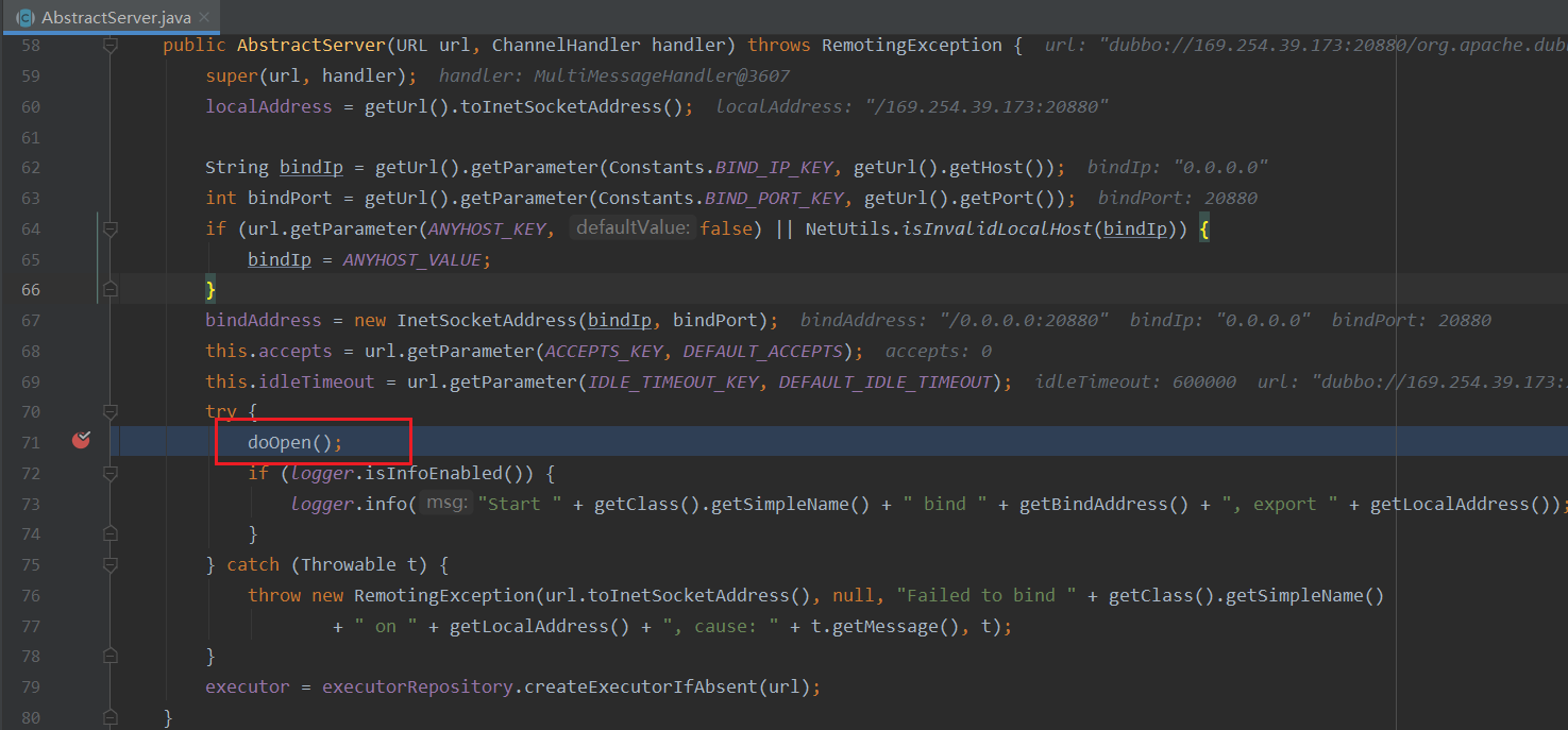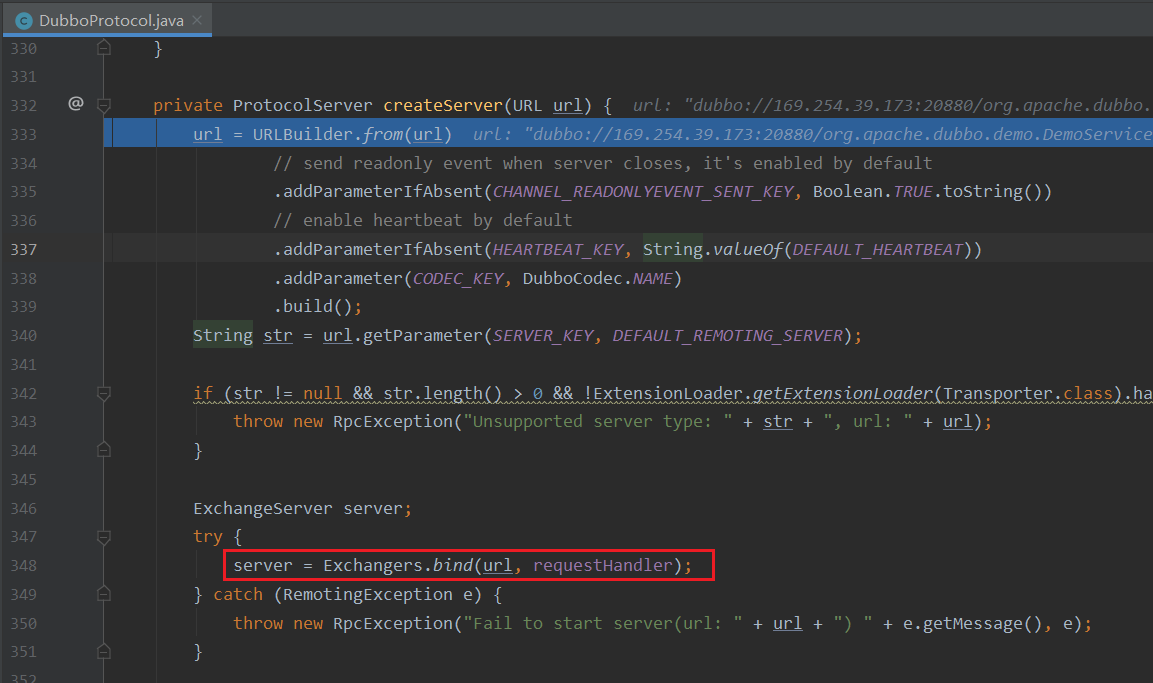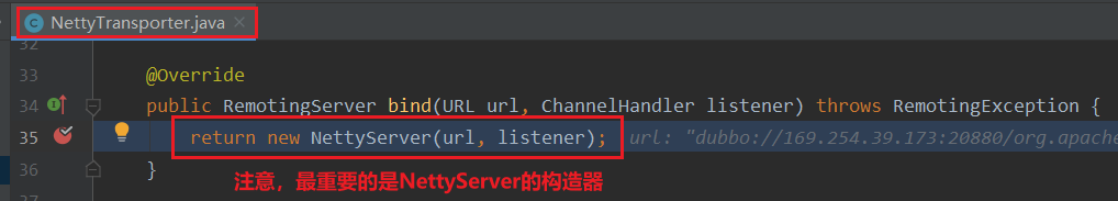 下面的createServer(url)方法就是创建netty服务端了,dubbo中默认netty监听埠是20880,所以平常我们如果本地20880埠占用了,那么启动dubbo服务就会失败的!