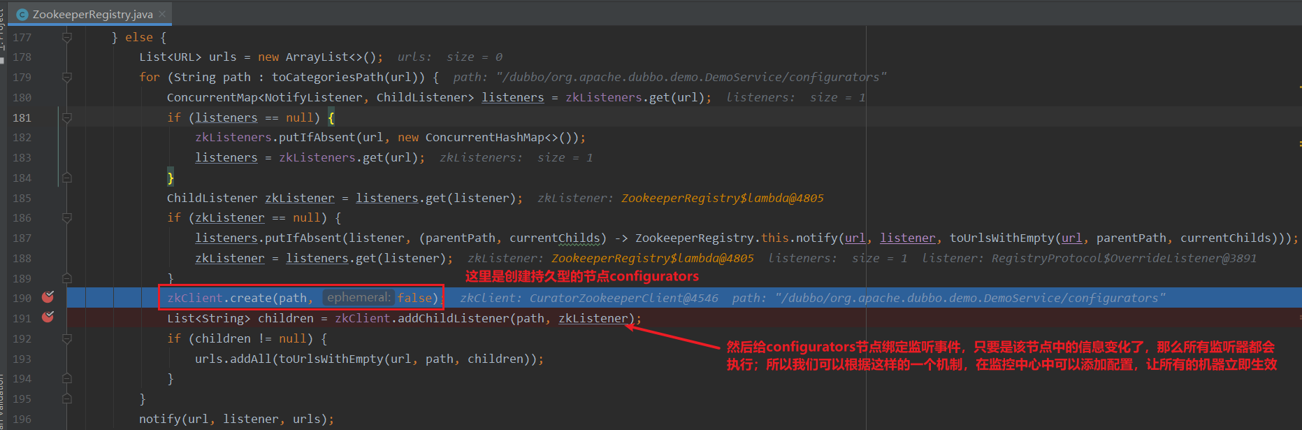 不知道大家有注意看到上图的zookeeper中有个节点是configurators,这个节点就是用于监听的(服务消费者和服务提供者都会去监听这个节点的哦!)