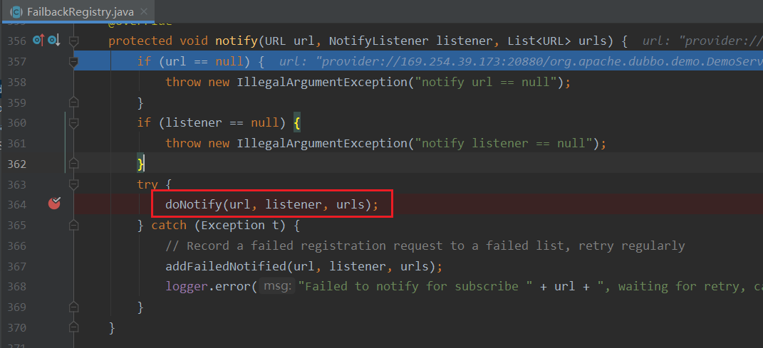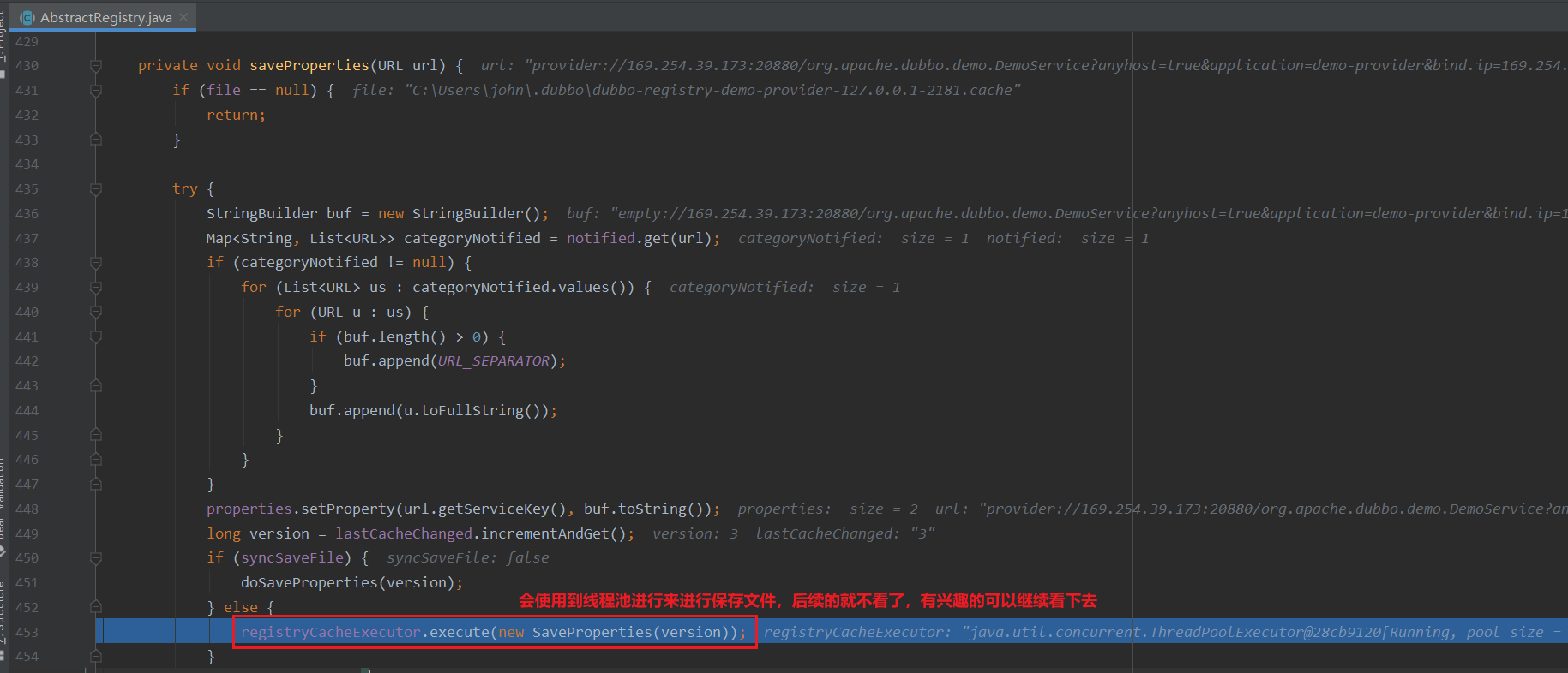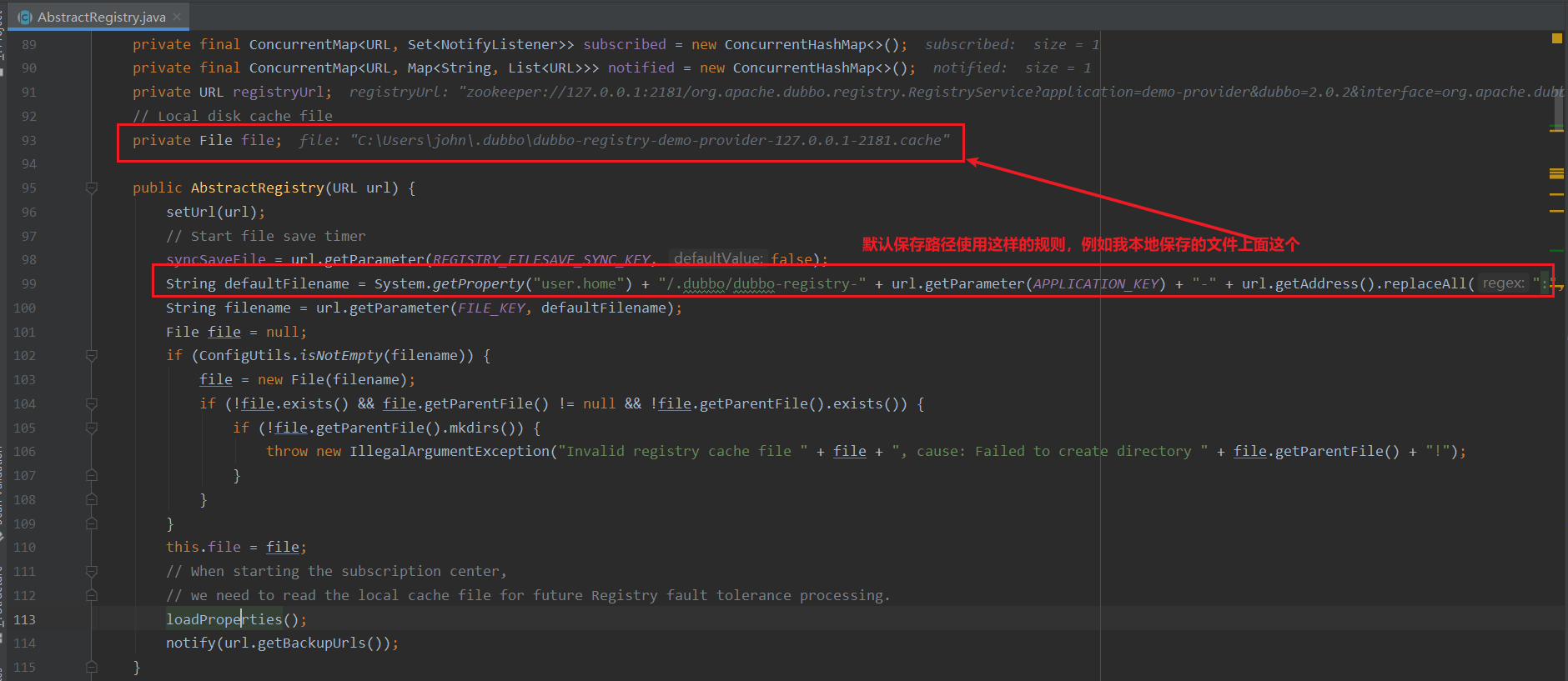 顺便一提: 注意上图中最后一行的notify方法,这里面会做一些特殊的事情,就是会将dubbo中服务提供者信息给保存成档案,本地磁盘保存一份,这样的话,即使注册中心挂了,但是服务也是可以正常使用的