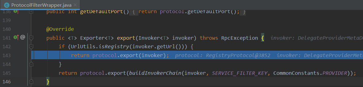 而且根据下图中444行,可以知道dubbo暴露服务是可以支持多个协议的,也就是每一种协议都会暴露一份(我们组态档只配置了dubbo协议)