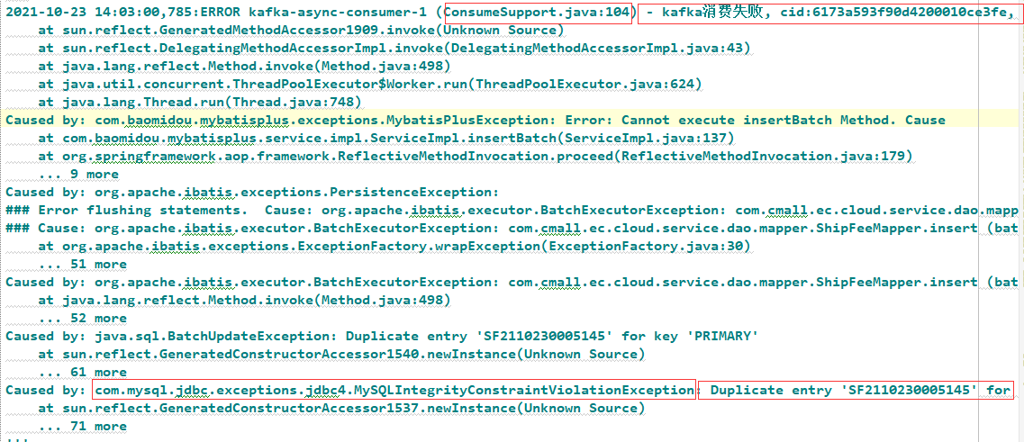 ### Cause: org.apache.ibatis.executor.BatchExecutorException: com.cmall.ec.cloud.service.dao.mapper.ShipFeeMapper.insert (batch index #1) failed. Cause: java.sql.BatchUpdateException: Duplicate entry 'SF2110230005145' for key 'PRIMARY'