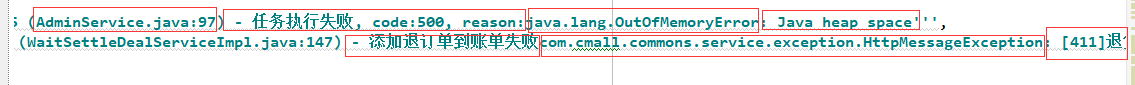 匹配第3个Pattern 匹配结果: ('WARN', 'AdminService.java', '97', ' - 任务执行失败, code:500, reason:', 'java.lang.OutOfMemoryError', ': Java heap space', '')