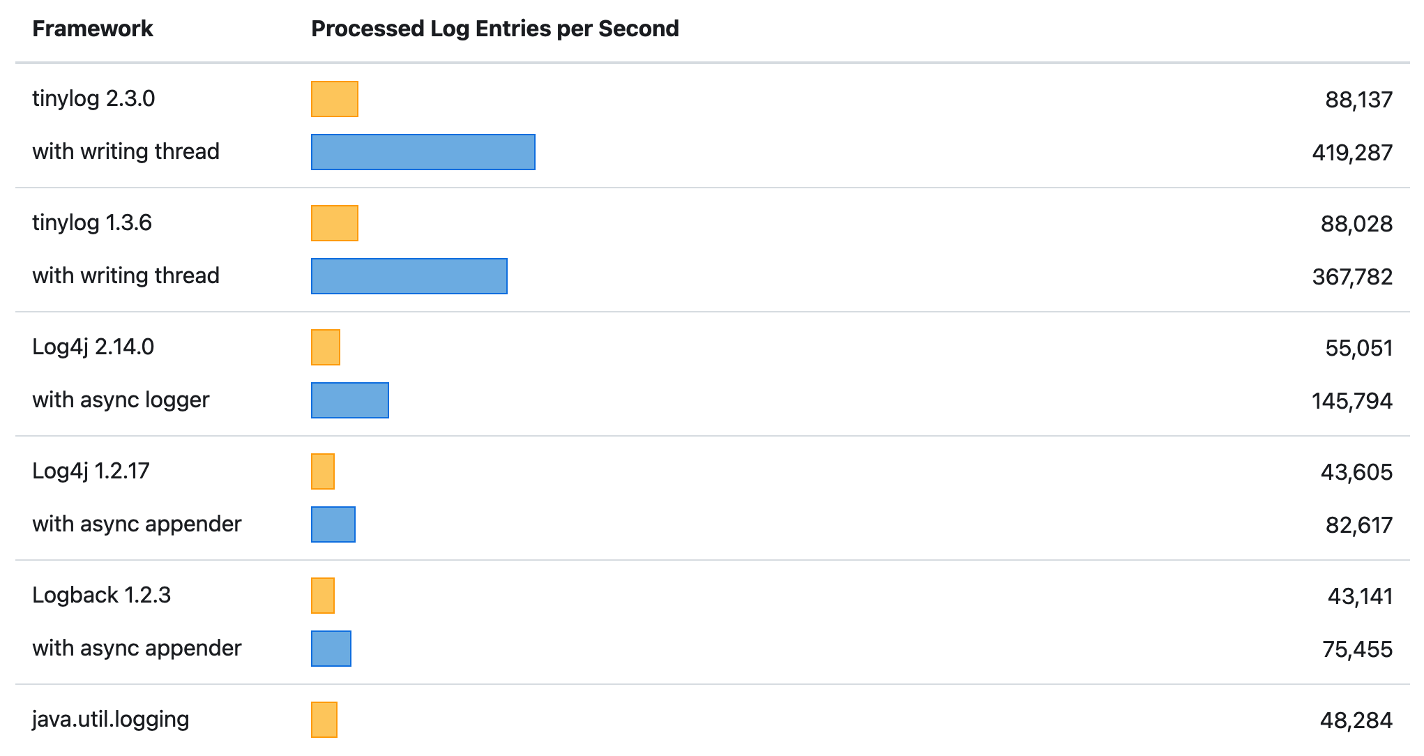 tinylog 对日志输出做了优化,日志输出性能更是十分了得,最快的时候甚至比 Log4j2 和 Logback 快数倍!