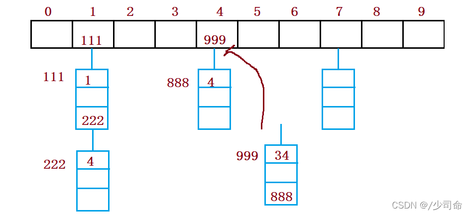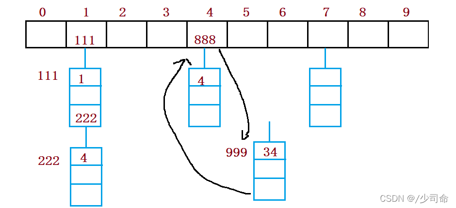 线性探测的缺陷是产生冲突的资料堆积在一块,这与其找下一个空位置有关系,因为找空位置的方式就是挨 着往后逐个去找,因此二次探测为了避免该问题,找下一个空位置的方法为: = ( + )% m, 或者: = ( - )% m,其中:i = 1,2,3…, 是通过散列函式Hash(x)对元素的关键码 key 进行计算得到的位置, m是表的大小, 对于2.1中如果要插入44,产生冲突,使用解决后的情况为: