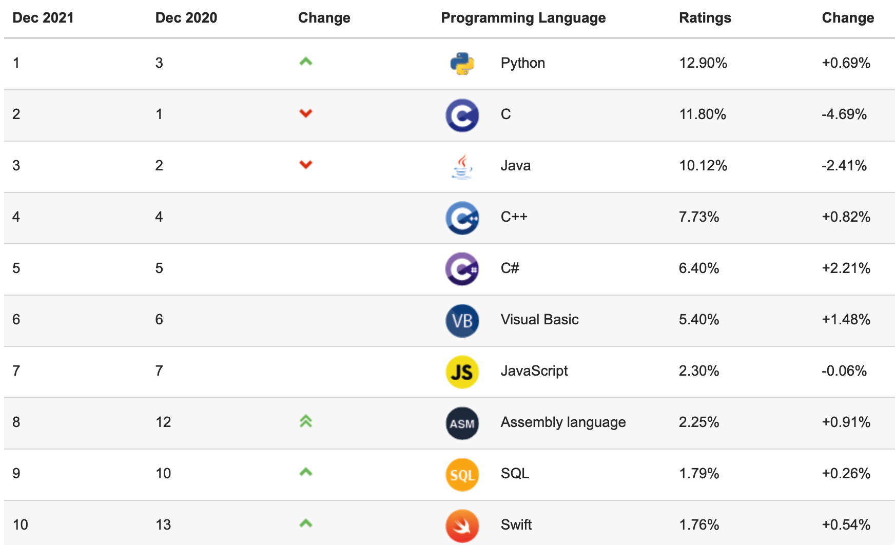 这也是这 20 多年来,继 C 和 Java 语言之后,首次出现的新的王者语言,Java 和 C 语言长期霸榜的时代已经结束了,Java 较去年又跌一名,现在已经轮为老三了,,,