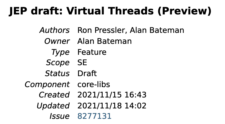 在 openjdk 的官网上,2021/11/15 这天创建了一个新的特性:JEP draft: Virtual Threads (Preview)