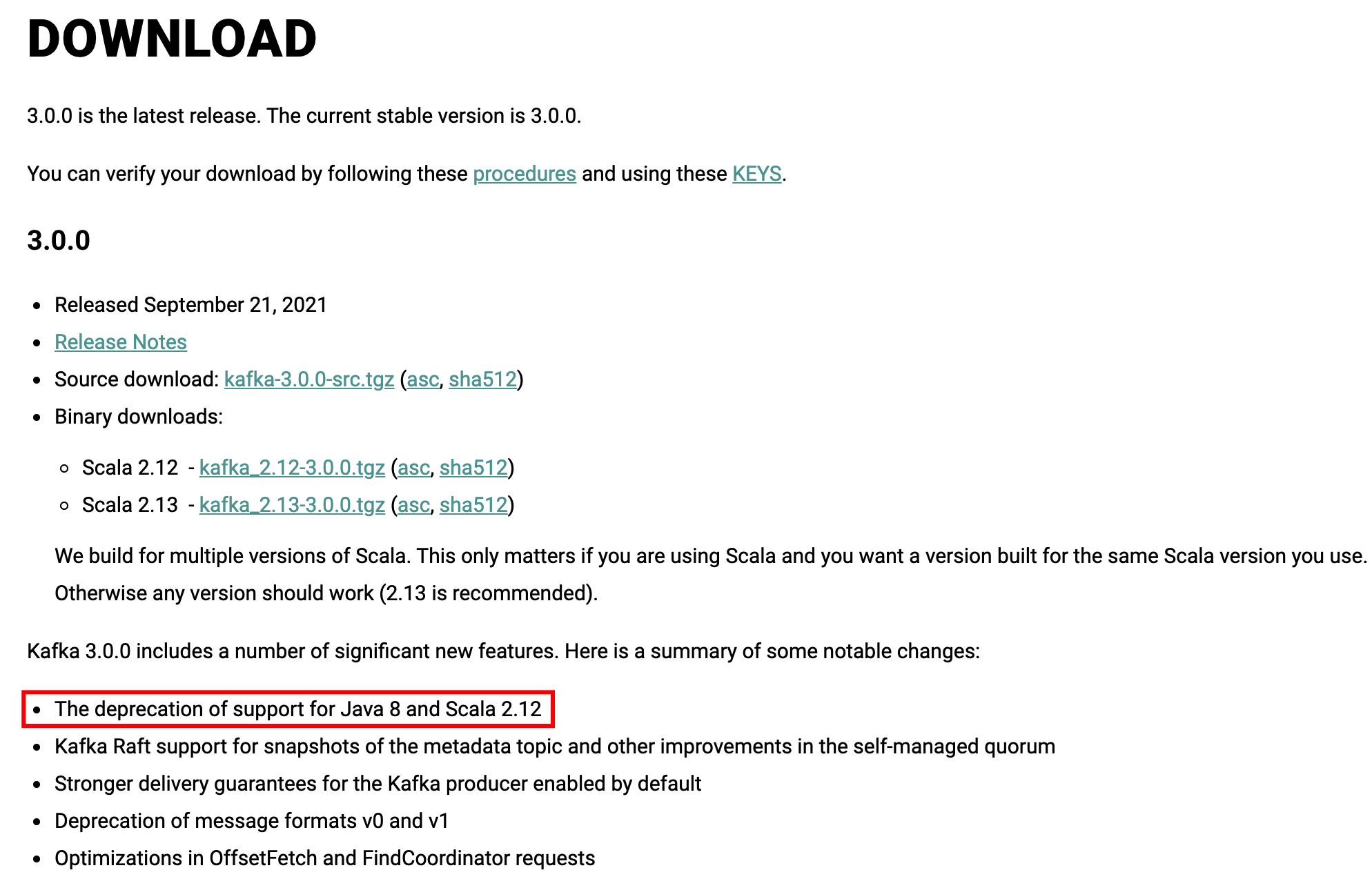 但 3.0.0 还能用,这次宣布只是给用户一个调整的时间,到了 Kafka 4.0,Java 8、Scala 2.12 将将正式取消支持,