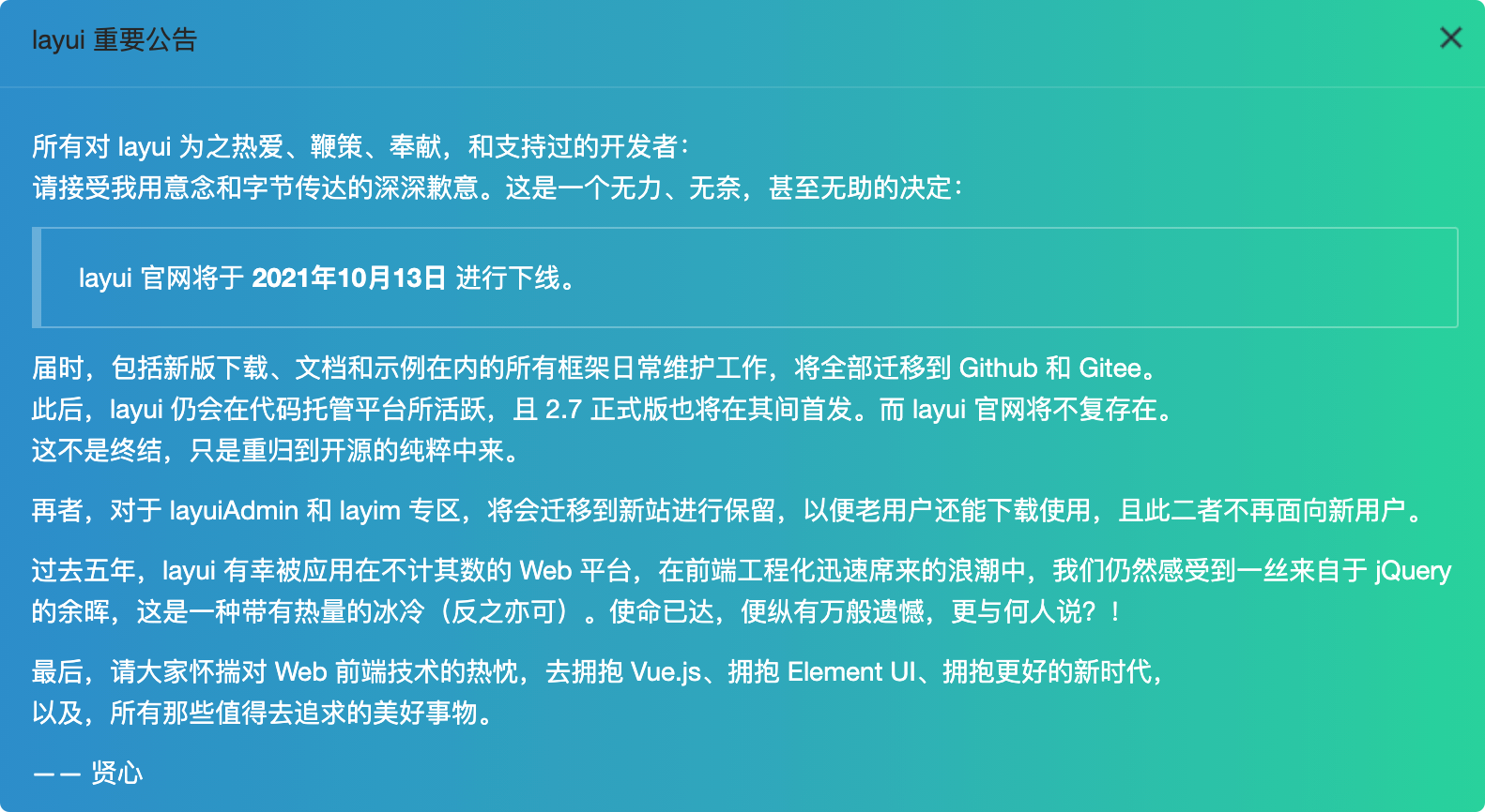 layui 官网将于 2021年10月13日 进行下线: