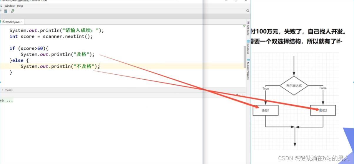 如图分析,及格的话流程走陈述句1,不及格的话走陈述句2