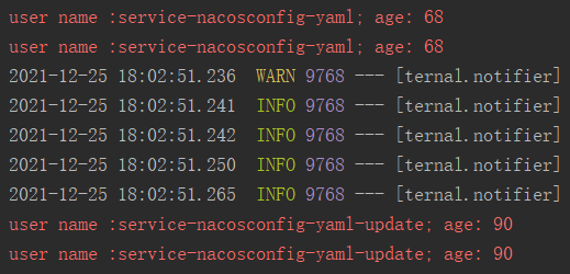 spring-cloud-starter-alibaba-nacos-config 也支持配置的动态更新,启动 Spring Boot 应用测验的代码如下: