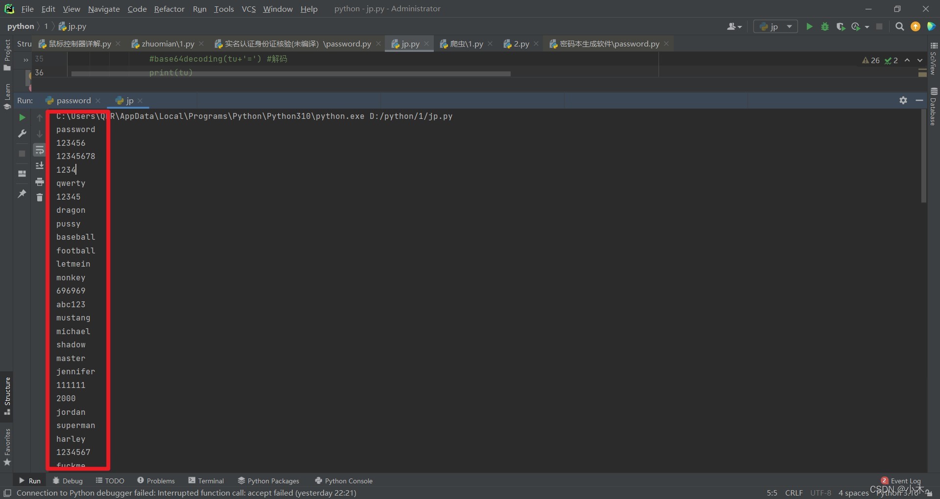 inpu = input('关注博主不迷路!!!\n\nhttps://jiangongfang.blog.csdn.net/\nhttps://blog.51cto.com/u_15449377\n\n-------------------------爬取世界常用密码-------------------------\n使用方法:输入数字1~100,数值越大,运行越慢\n1=100,2=200,3=300.....99=9900,100=10000\n-------------------------爬取世界常用密码------------------------- \n请输入数值:')