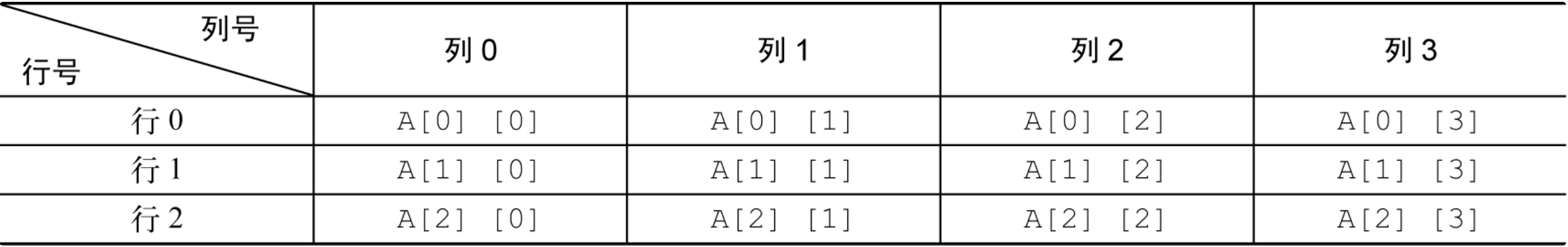 下面以一个二维阵列为例,看一下 3 行 4 列的阵列的内部结构,如下图所示,