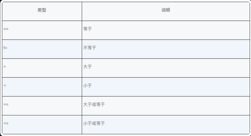 在数学运算中有大于、小于、等于、不等于关系,在程序中可以使用关系运算子来表示上述关系,下图中列出了 Java 中的关系运算子,通过这些关系运算子会产生一个结果,这个结果是一个布林值,即 true 或 false,在 Java 中,任何型别的资料,都可以用 == 比较是不是相等,用 != 比较是否不相等,只有数字才能比较大小,关系运算的结果可以直接赋予布尔变量,