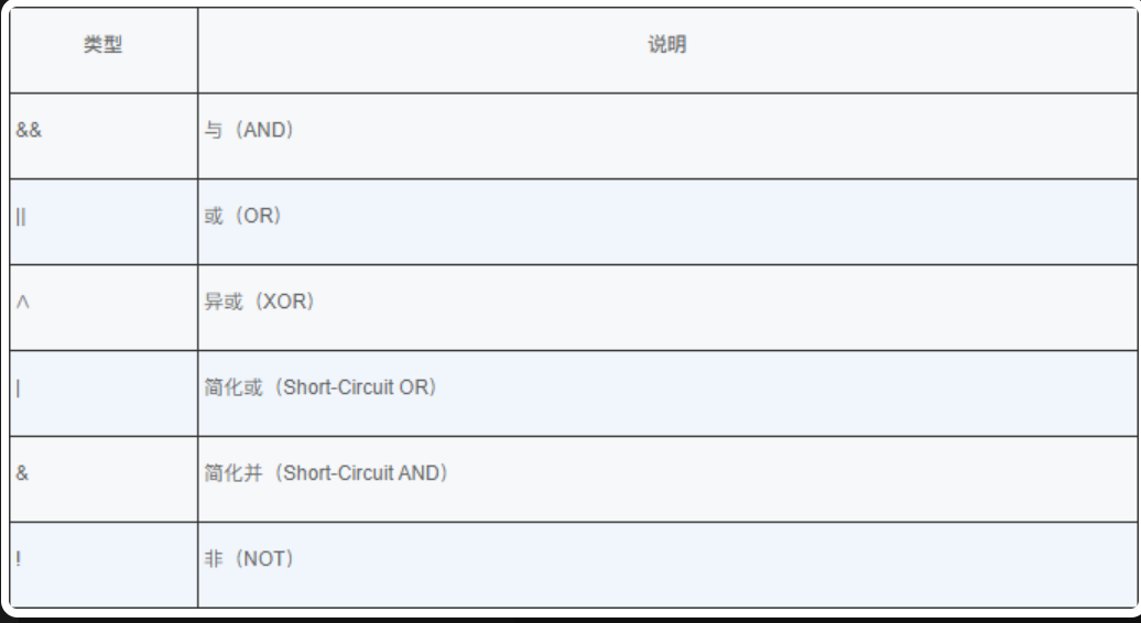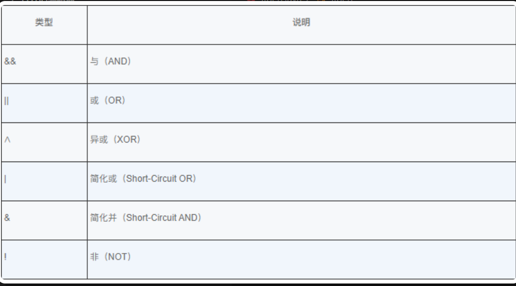 布尔逻辑运算子是最常见的逻辑运算子,用于对布尔型操作数进行布尔逻辑运算,Java 中的布尔逻辑运算子如下图示,