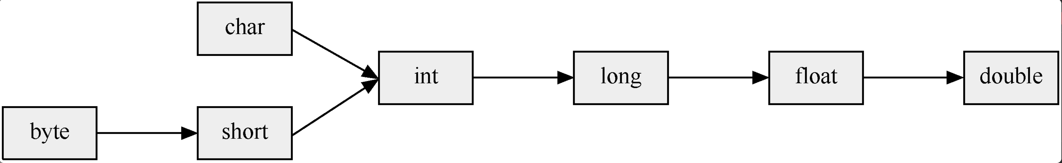 Java 中所有数值型变量之间可以进行型别转换,取值范围小的可以向取值范围大的进行自动型别转换,就好比有两瓶水,当把小瓶里的水倒入大瓶时不会有任何问题,Java 支持自动型别转换的型别如下图所示,