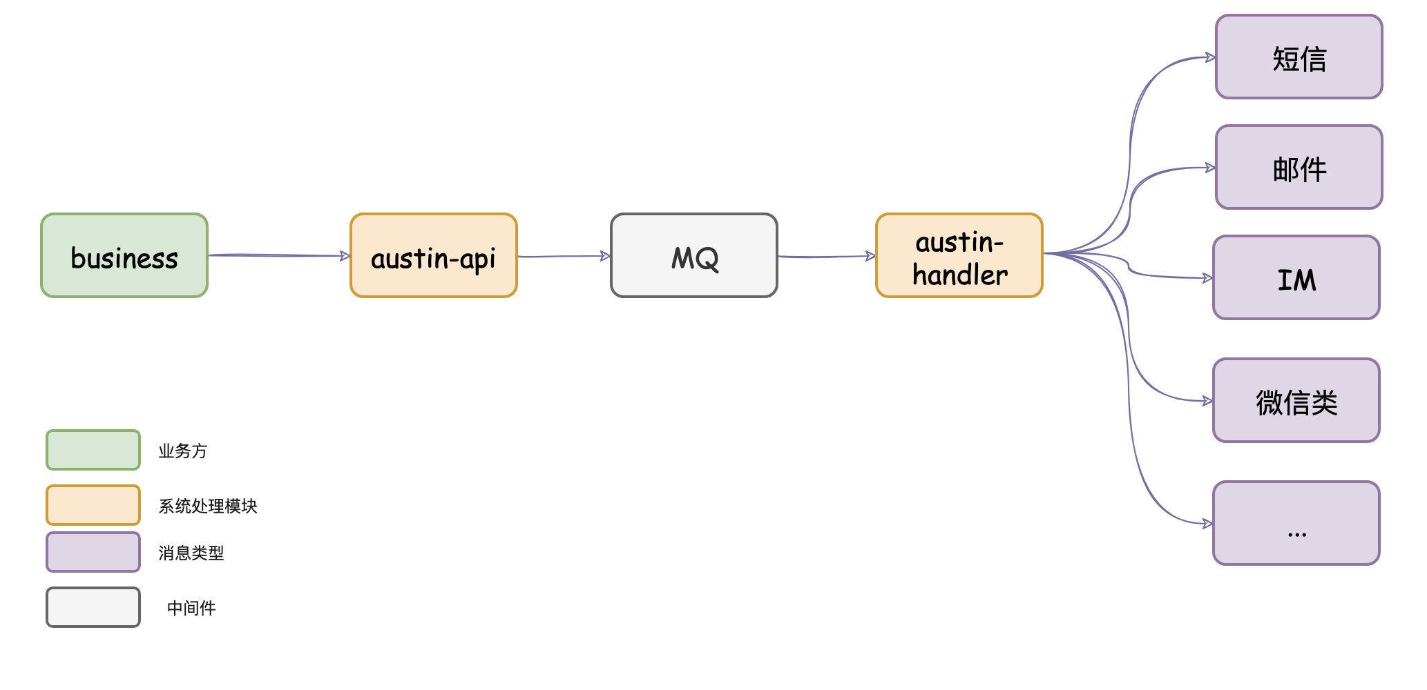 这样做有什么好处呢?假设某讯息的服务超时,austin-api如果是直接呼叫下发界面服务,那可能会存在超时风险,拖垮整个界面性能,MQ在这是为了做异步和解耦,并且在一定程度上抗住业务流量,