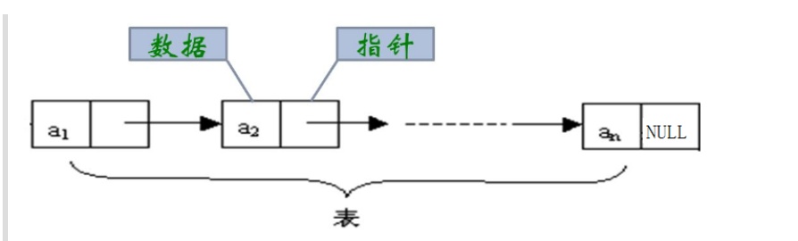 接次序实作的,相当于一个一个的结点链接在一起就构成了链表.如下图所示.