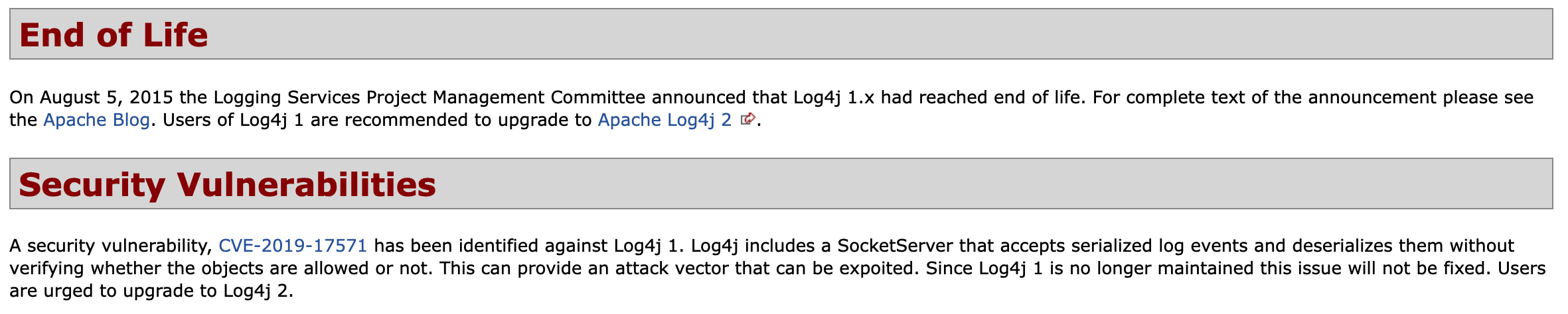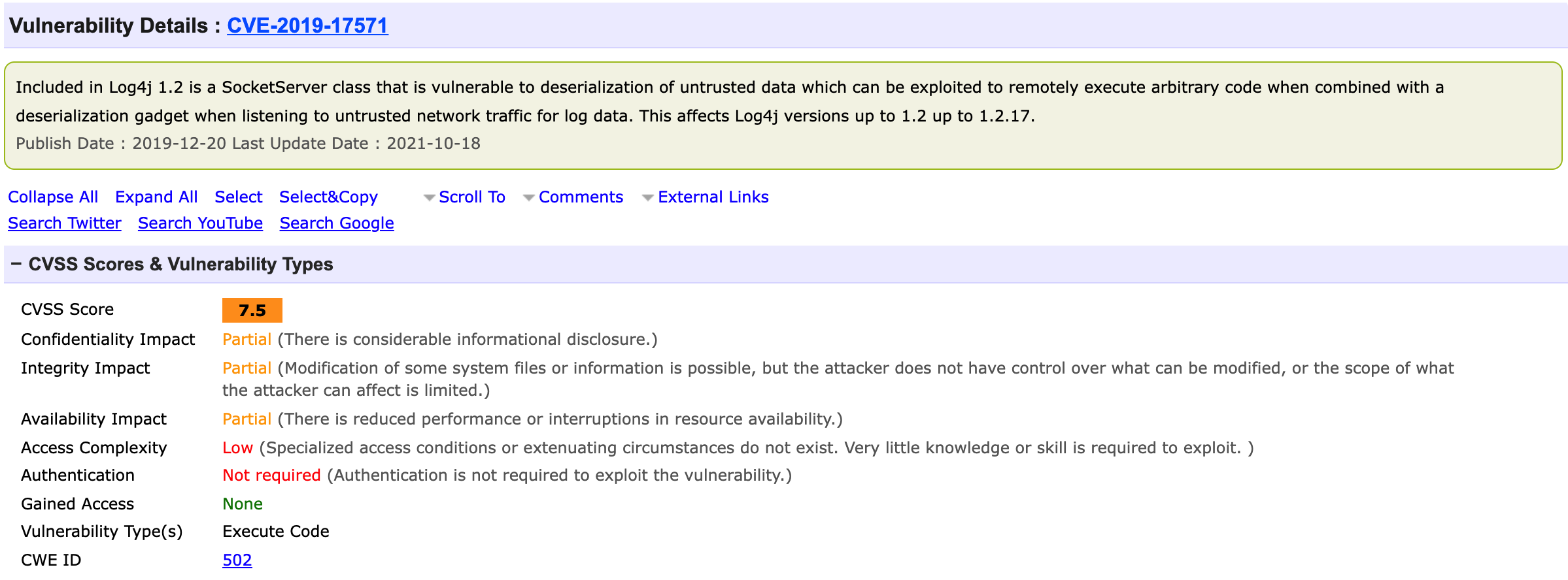 关注度少,不代表就能高枕无忧,Log4j 1.x 在 2019 年就爆了一次雷,在 Log4j 1.x 中发现了一个已知的安全漏洞 CVE-2019-17571: