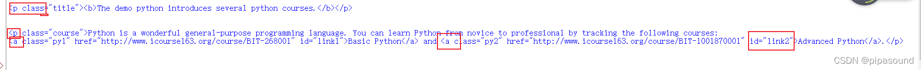 <a class="py1" href="http://www.icourse163.org/course/BIT-268001" id="link1">Basic Python</a> and <a class="py2" href="http://www.icourse163.org/course/BIT-1001870001" id="link2">Advanced Python</a>.</p>, '\n']