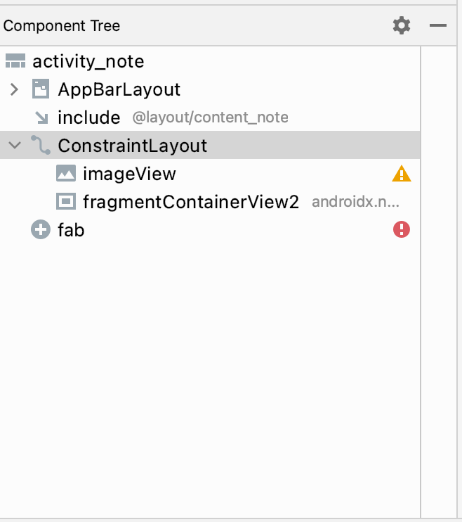 问题是您在 xml 代码中使用了 layout_gravity,该代码适用于某些视图组,例如FrameLayout但不适用于ConstraintLayout. 第二个事实是您不需要使用嵌套的 ConstraontLayouts,一个将处理您所有的 ui 要求。因此,对于AppBar您可以使用的第一个app:layout_constraintTop_toTopOf="parent"和内容注释,您也可以将其限制在 appBar 的底部。像这样:app:layout_constraintTop_toBottomOf="@ id/appBar"对于影像缩略图,也可以使用 this:app:layout_constraintTop_toBottomOf="@ id/contentNote"与app:layout_constraintStart_toStartOf="parent"最后一个作为 fragmentContainer一起使用,您可以使用 this app:layout_constraintTop_toBottomOf="@ id/imageView"。这样,所有这些都将相互约束并且运行良好。对于与父布局相关的任何其他约束,您也可以添加它们的约束。