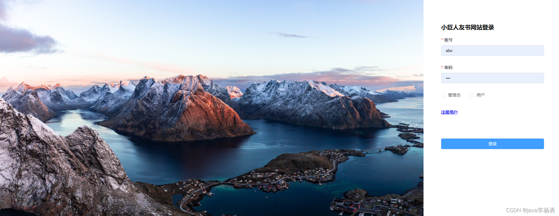 用户登录:分为管理员和普通用户进行登录、也可以在这里进行用户注册,