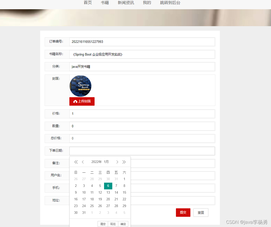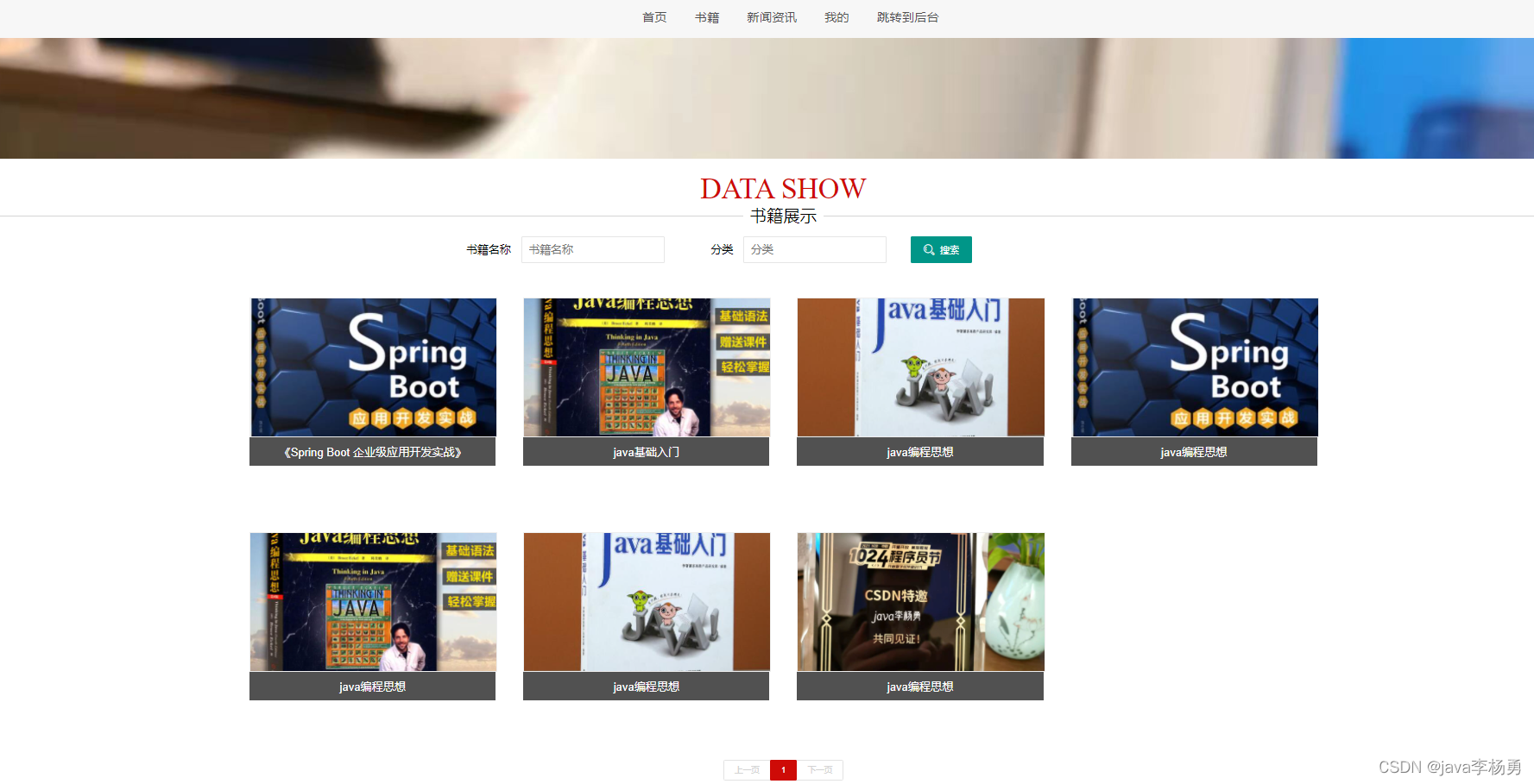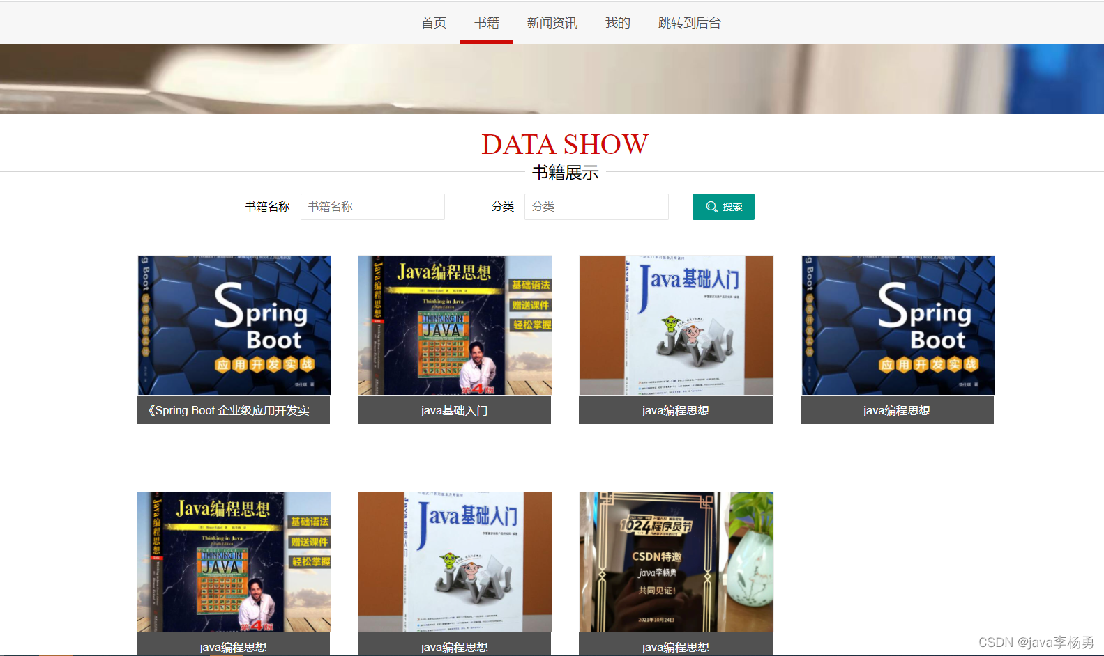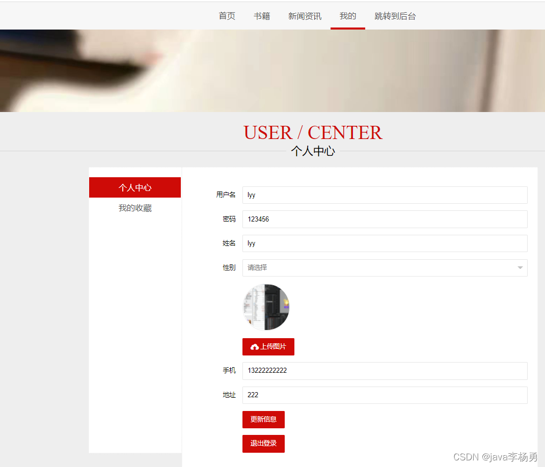 前端用户首页:用户登录后、可以查看新上架的书籍和新闻等书籍、点击进入详情查看购买书籍、加入购物车以及对自己感兴趣的图书书籍收藏等操作和查看修改个人信息等,