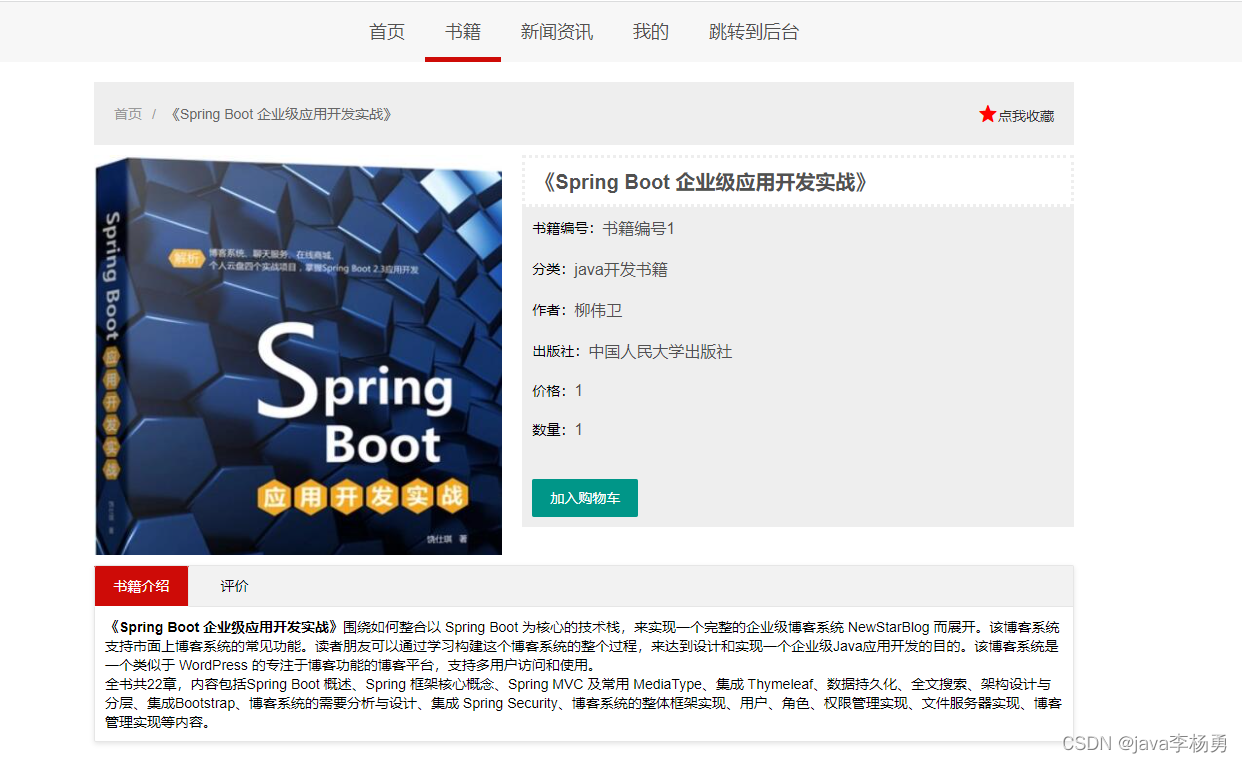 书籍详情页:查看书籍详情信息、可以加入购物车和收藏等查看、也可以查看用户评论信息等