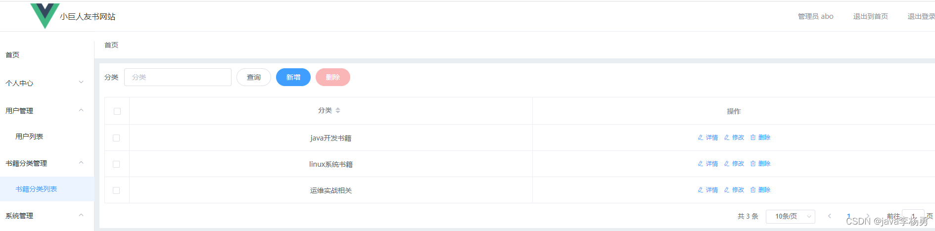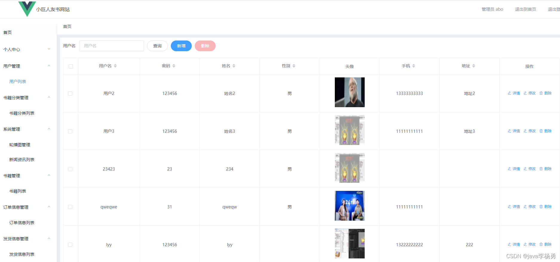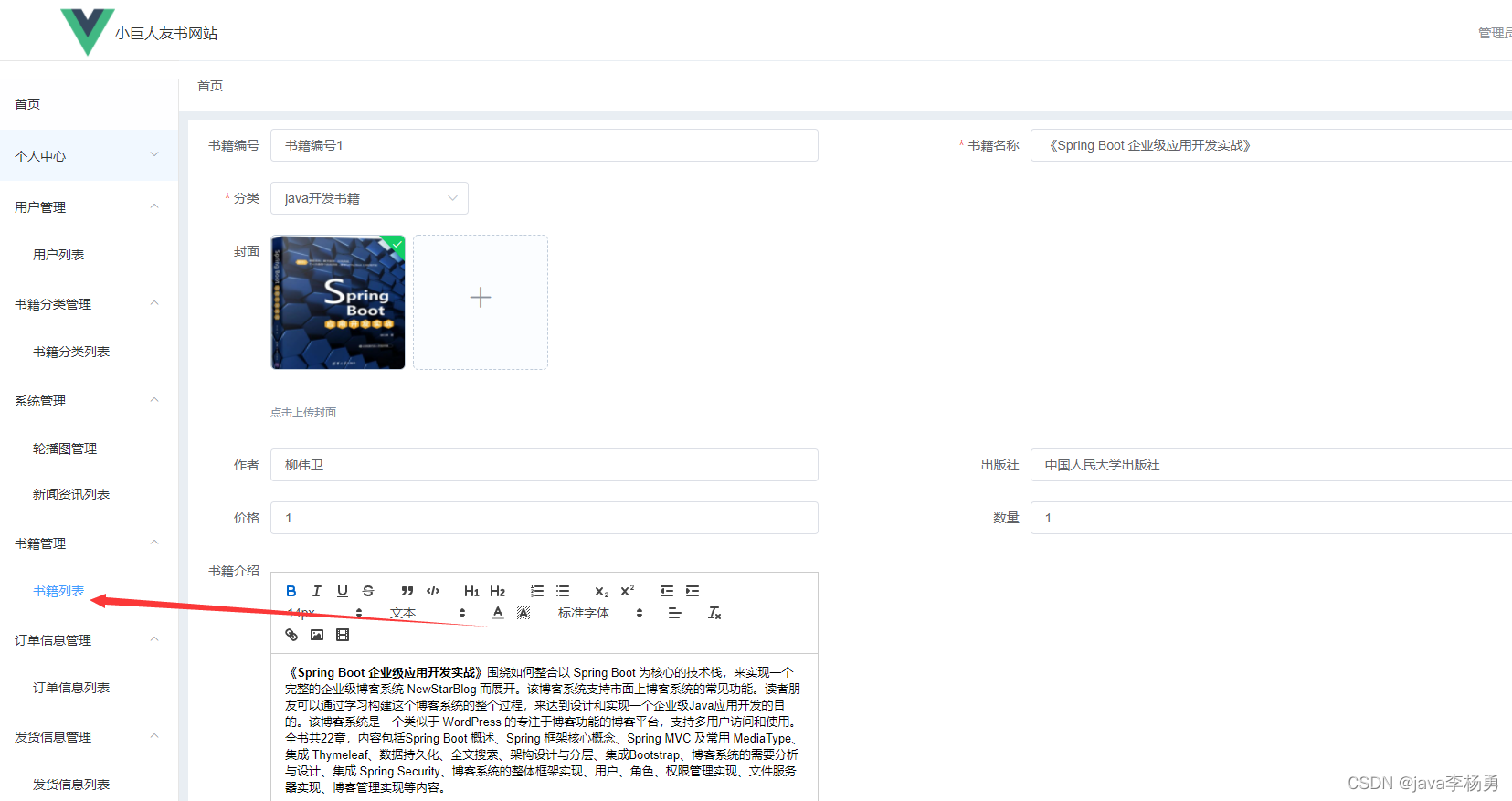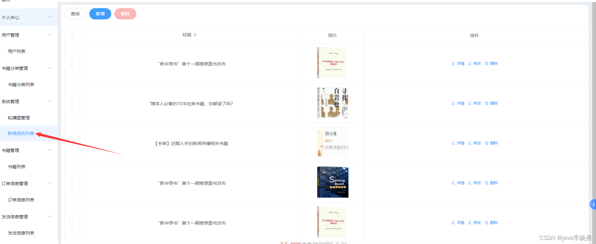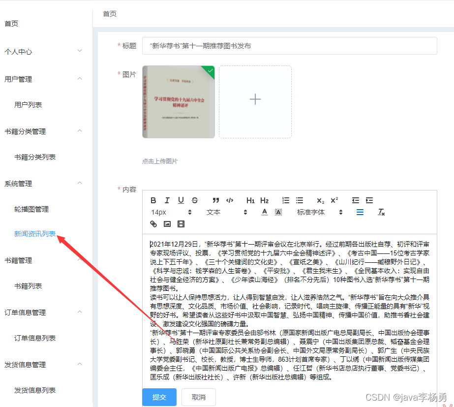 管理员首页:图书商城系统管理员登录后主要有如下功能模块:用户个人信息管理、修改密码、图书分类管理、图书商品详情管理、首页轮播图管理、新闻信息管理、书籍串列管理、订单信息管理和发货信息管理等,