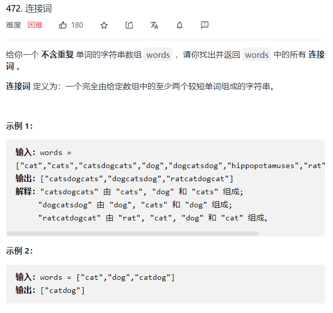 我们可以先把单词阵列按照长度从小到大排序,这样就可以边检测边判断是否有连接词,因为连接词是由其他单词组成的,所以它的长度肯定更长,在后面才做匹配程序,如果不是连接词再把它加入到字典树中去,
