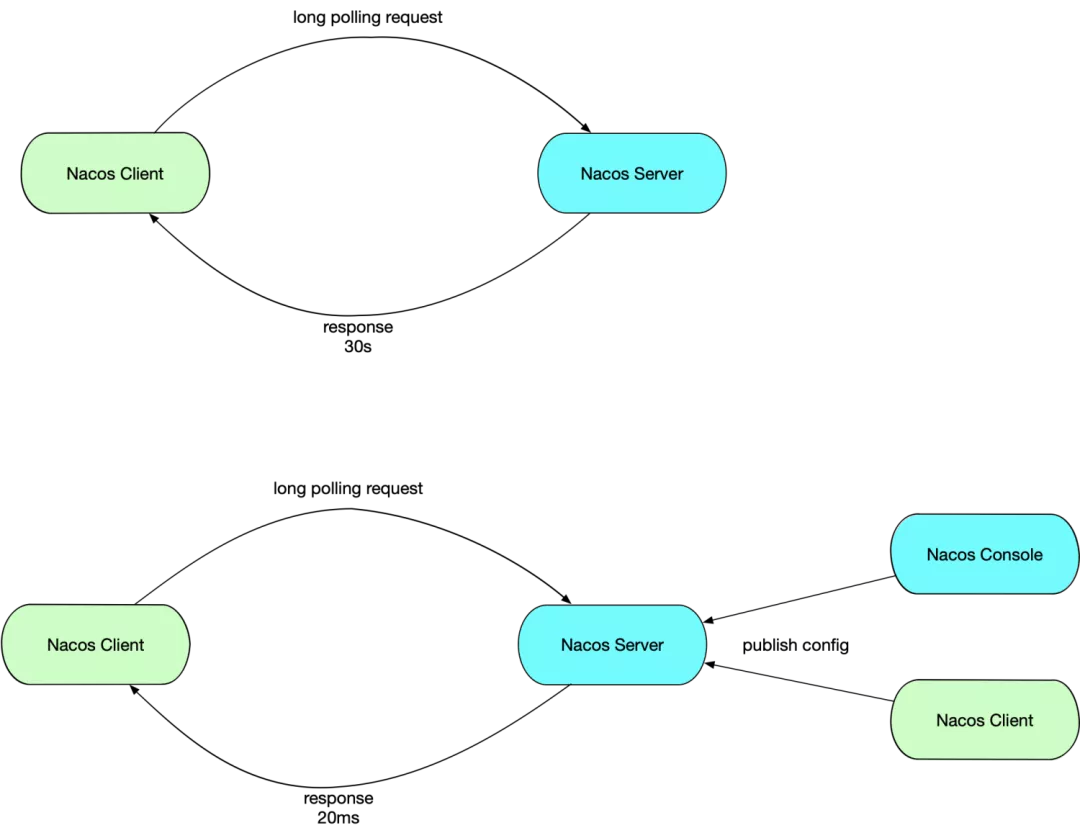 可能有人会有疑问,为什么一次长轮询需要等待一定时间超时,超时后又发起长轮询,为什么不让服务端一直 hold 住?主要有两个层面的考虑,一是连接稳定性的考虑,长轮询在传输层本质上还是走的 TCP 协议,如果服务端假死、fullgc 等例外问题,或者是重启等常规操作,长轮询没有应用层的心跳机制,仅仅依靠 TCP 层的心跳保活很难确保可用性,所以一次长轮询设定一定的超时时间也是在确保可用性,除此之外,在配置中心场景,还有一定的业务需求需要这幺设计,在配置中心的使用程序中,用户可能随时新增配置监听,而在此之前,长轮询可能已经发出,新增的配置监听无法包含在旧的长轮询中,所以在配置中心的设计中,一般会在一次长轮询结束后,将新增的配置监听给捎带上,而如果长轮询没有超时时间,只要配置一直不发生变化,回应就无法回传,新增的配置也就没法设定监听了,