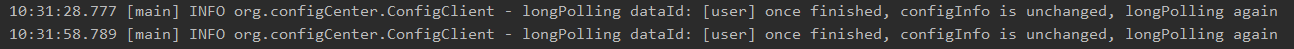 先启动 ConfigServer,再启动 ConfigClient,客户端打印长轮询的日志如下: