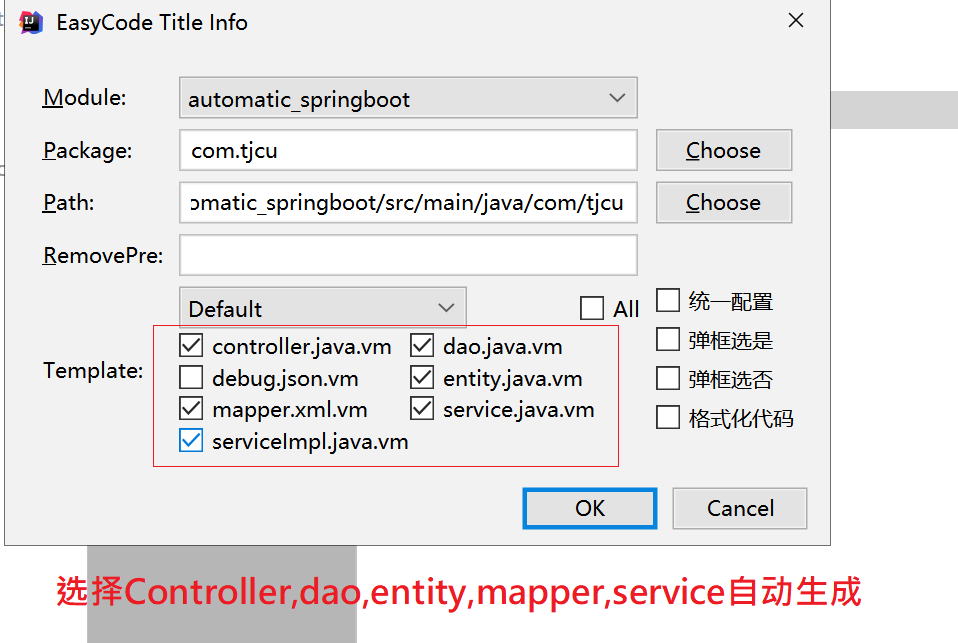 - 选择entity(物体类层)、controller(控制层)、service(业务层)、dao(dao层)、mapper(mapper档案)