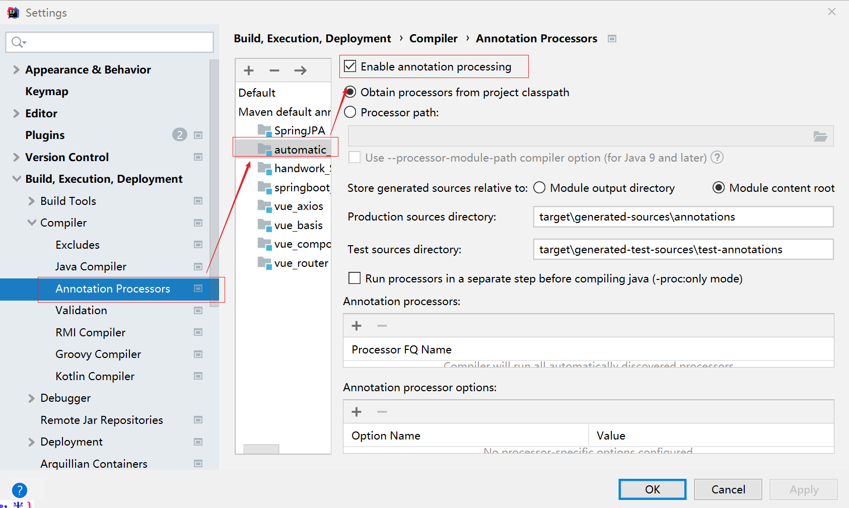 - 点击File-- Settings设定界面,开启 AnnocationProcessors: