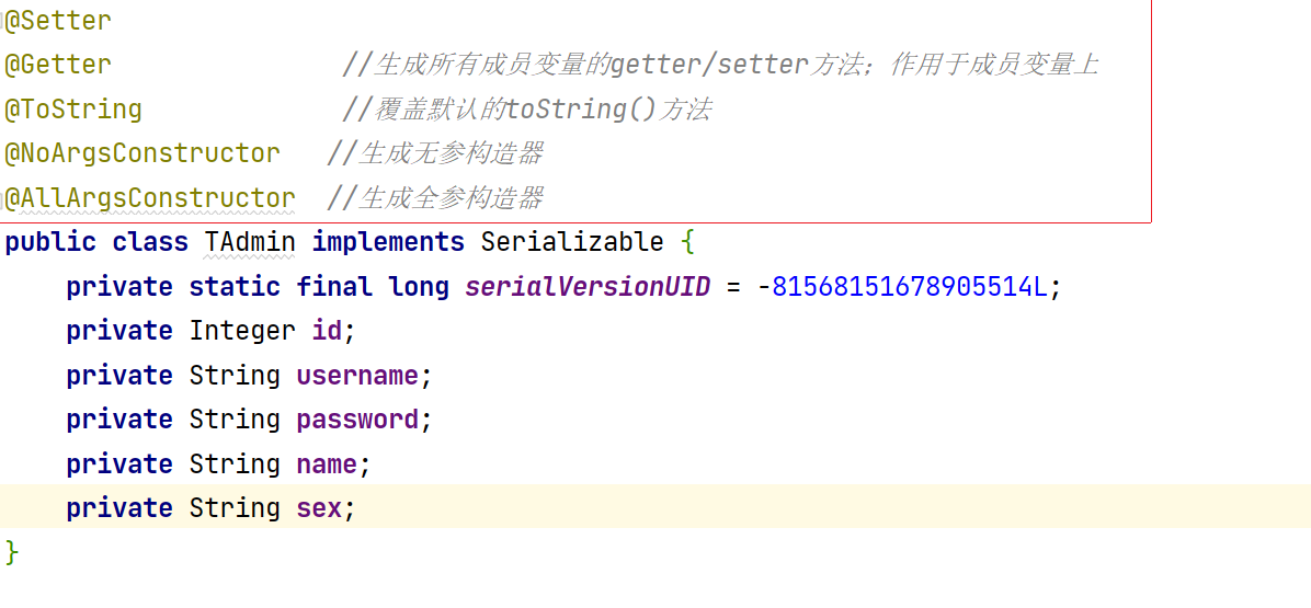 getter/setter方法;作用于成员变量上,生成该成员变量的getter/setter方法,可以设定访问权限及是否懒加载等,