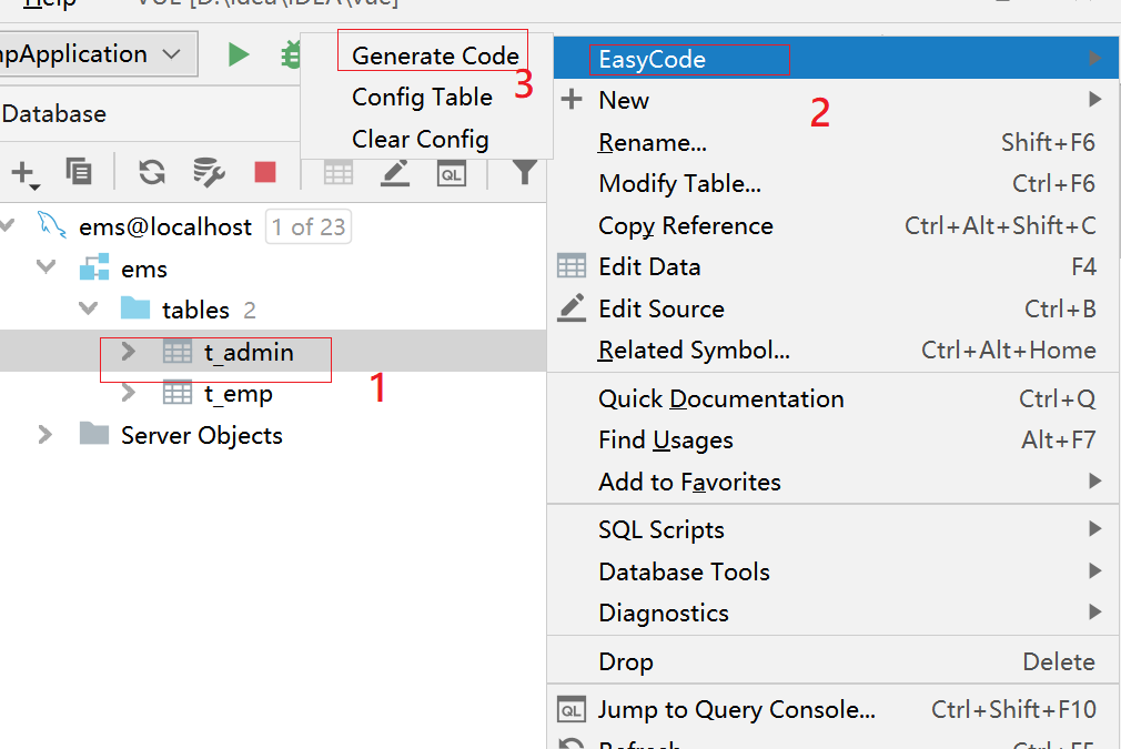 - 右击数据库表=》选EasyCode=》选择GenerateCode